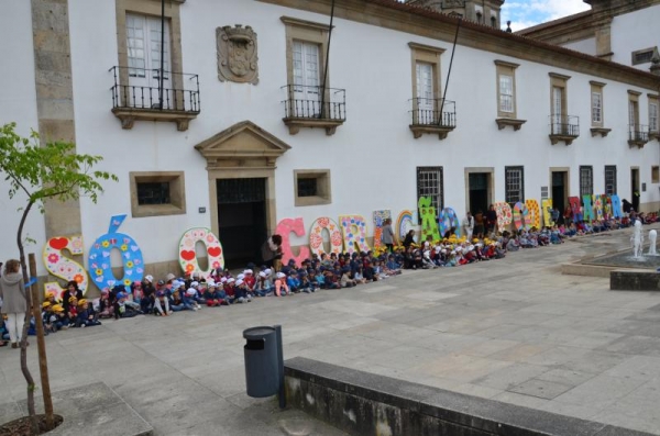 As letras da mensagem em tamanho grande foram pintadas pelas várias turmas de educação pré-escolar e contaram com a colaboração do Centro de Teatro da Câmara Municipal de Cabeceiras de Basto (CPCJ).