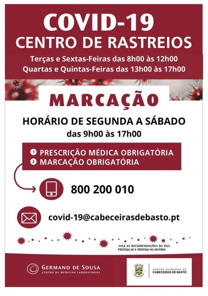 A partir da próxima terça-feira, 14 de abril, entrará em funcionamento o Centro de Rastreio Covid-19, em Cabeceiras de Basto, com a garantia de qualidade do Centro de Medicina Laboratorial Germano de Sousa.